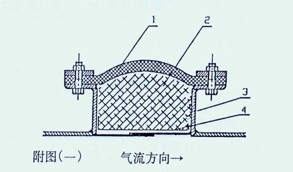 非金屬補(bǔ)償器是由:(1)非金屬復(fù)合圈帶 (2)隔熱填料層 (3)機(jī)架 (4)不銹鋼絲網(wǎng)等組成。見附圖。